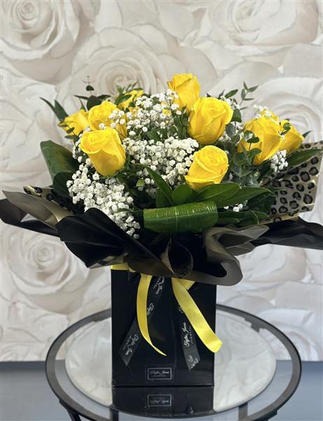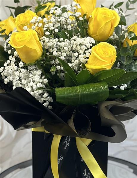 A stunning bouquet of the best large headed yellow roses, with mixed foliages and gypsophila