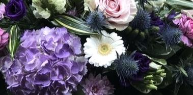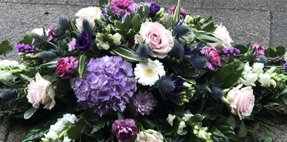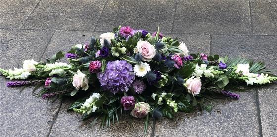 Beautiful double ended oasis spray, purples, lilacs and blue