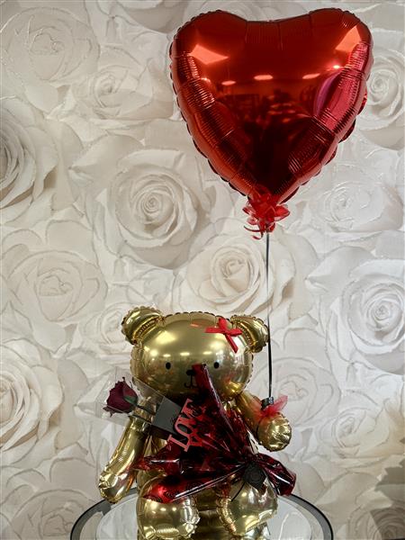 This elegant set features a stunning gold air-filled teddy bear designed to stay perfect for ages.