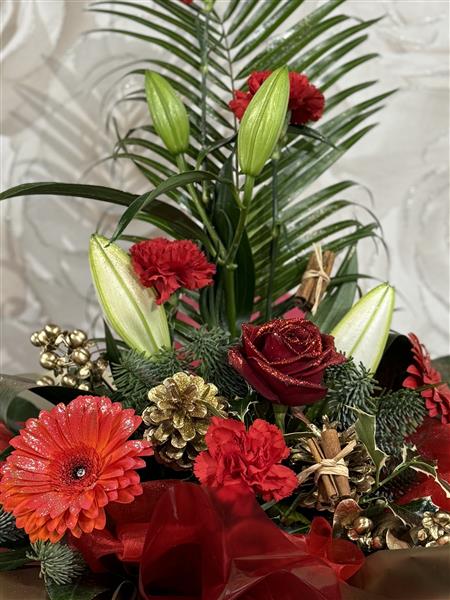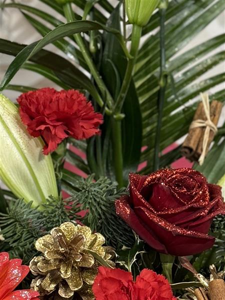 * Spice & Sparkle: Nestled among the blooms are beautiful pine cones, gold glitter accents, and a touch of natural Cinnamon stick for that warming, gingerbread-inspired aroma.