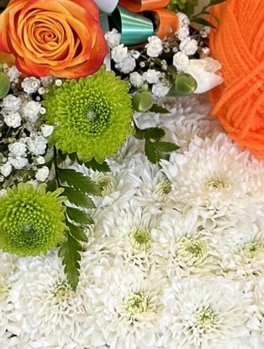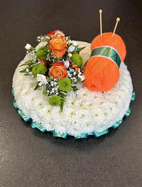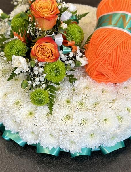 Massed posy pad tribute, with a ball of wool and knitting needles