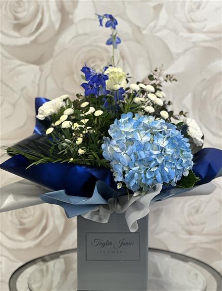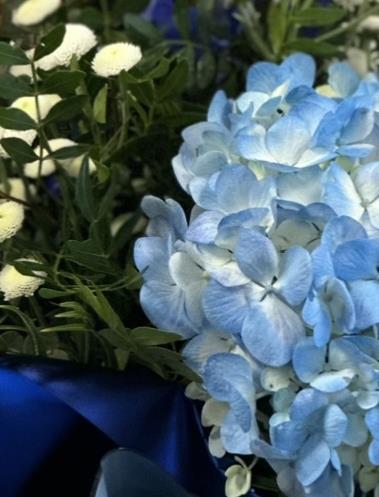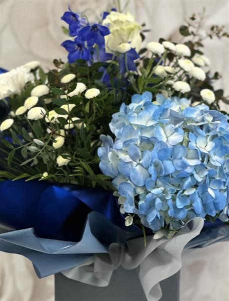 A beautiful selection of flowers and foliages in shades of blue and white.