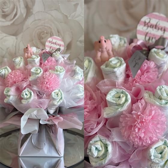 Celebrate a beautiful arrival with our Pink Nappy Bouquet, a perfect blend of charm and newborn essentials. This handcrafted gift features 24 premium nappies artfully rolled into "blooms," a sweet elephant keepsake, and a "Baby Girl" pick. Elegantly wrapped in pink tulle and silk ribbons, it makes a stunning, ready to display centrepiece for any baby shower or welcome home gift.