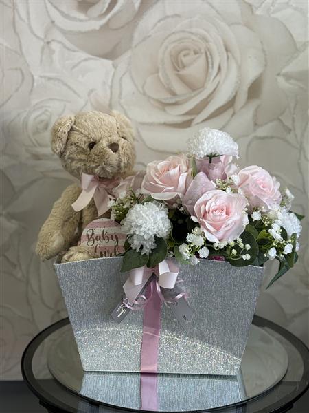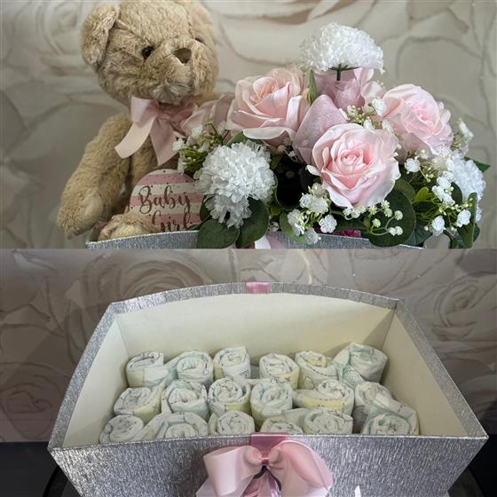 Our Pink Teddy & Floral Nappy Gift Set is a beautiful way to celebrate a new baby girl. This thoughtfully curated gift features a soft, cuddly teddy bear paired with a charming keepsake tin filled with a stunning arrangement of everlasting artificial flowers. Hidden beneath the floral display are 24 premium nappies, expertly organised for the new parents. Finished with a sweet "Baby Girl" tag and elegant pink ribbons, this set provides a lovely nursery keepsake long after the nappies are gone. This gift will come gift wrapped in clear cellophane with bows.