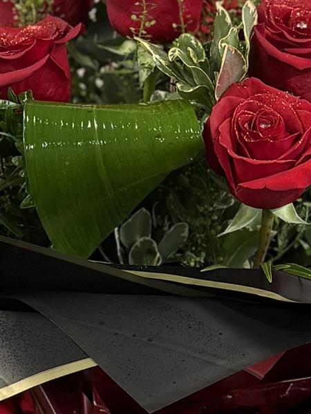 Surrounding this regal centerpiece is a full dozen of our finest premium red roses. Each bloom is delicately accented with subtle glitter and a shimmering diamante pin for that extra touch of "wow."