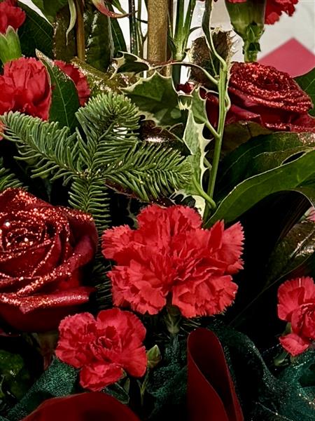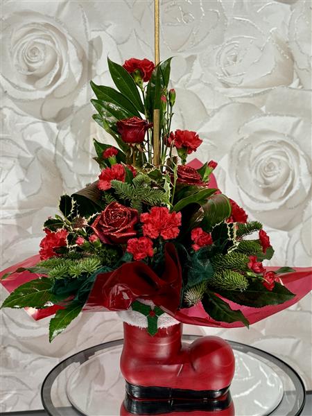 Packed with Christmas joy, this vibrant display is brimming with cheerful bright red blooms, including perfect red glittered roses and vibrant carnations. Tucked inside an adorable, chunky red ceramic Santa Boot, and accented with playful festive foliage, this arrangement is guaranteed to bring a smile. The Santa Baby is the cutest way to say Merry Christmas!