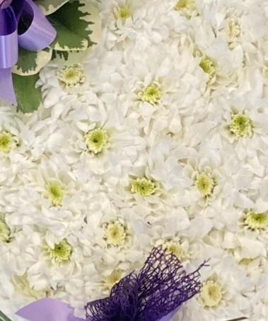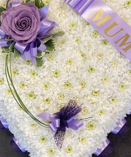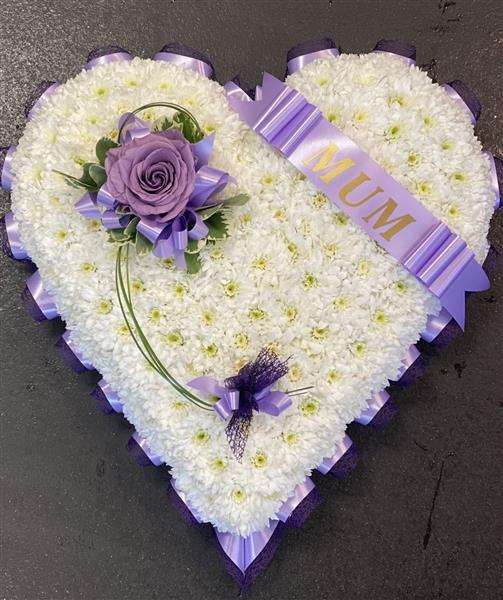 A simple but stunning white massed full heart, Edged with ribbon with a single rose spray