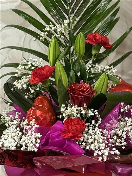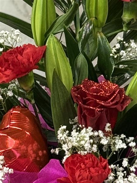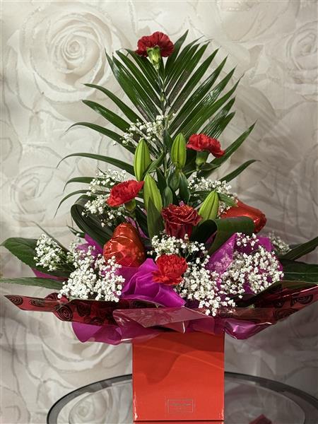 this arrangement is softened with delicate gypsophila and accented with hidden heart balloons.