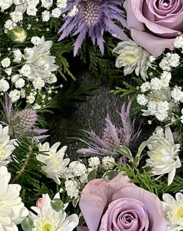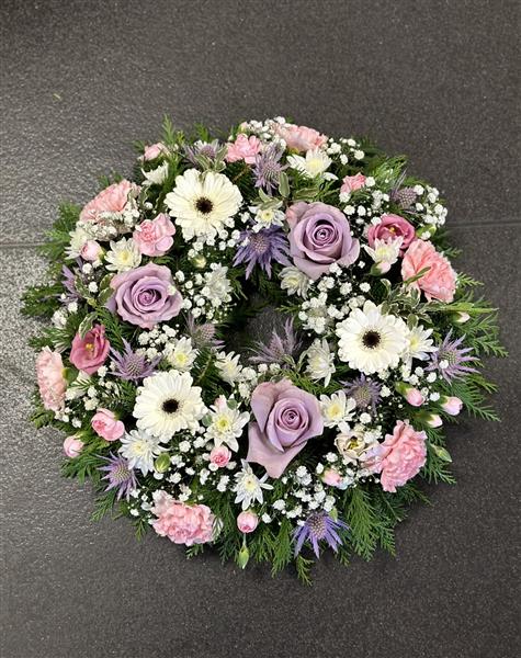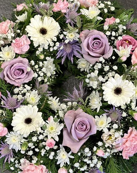 A pretty mixed wreath in pastel shades of lilac, white and pale pink